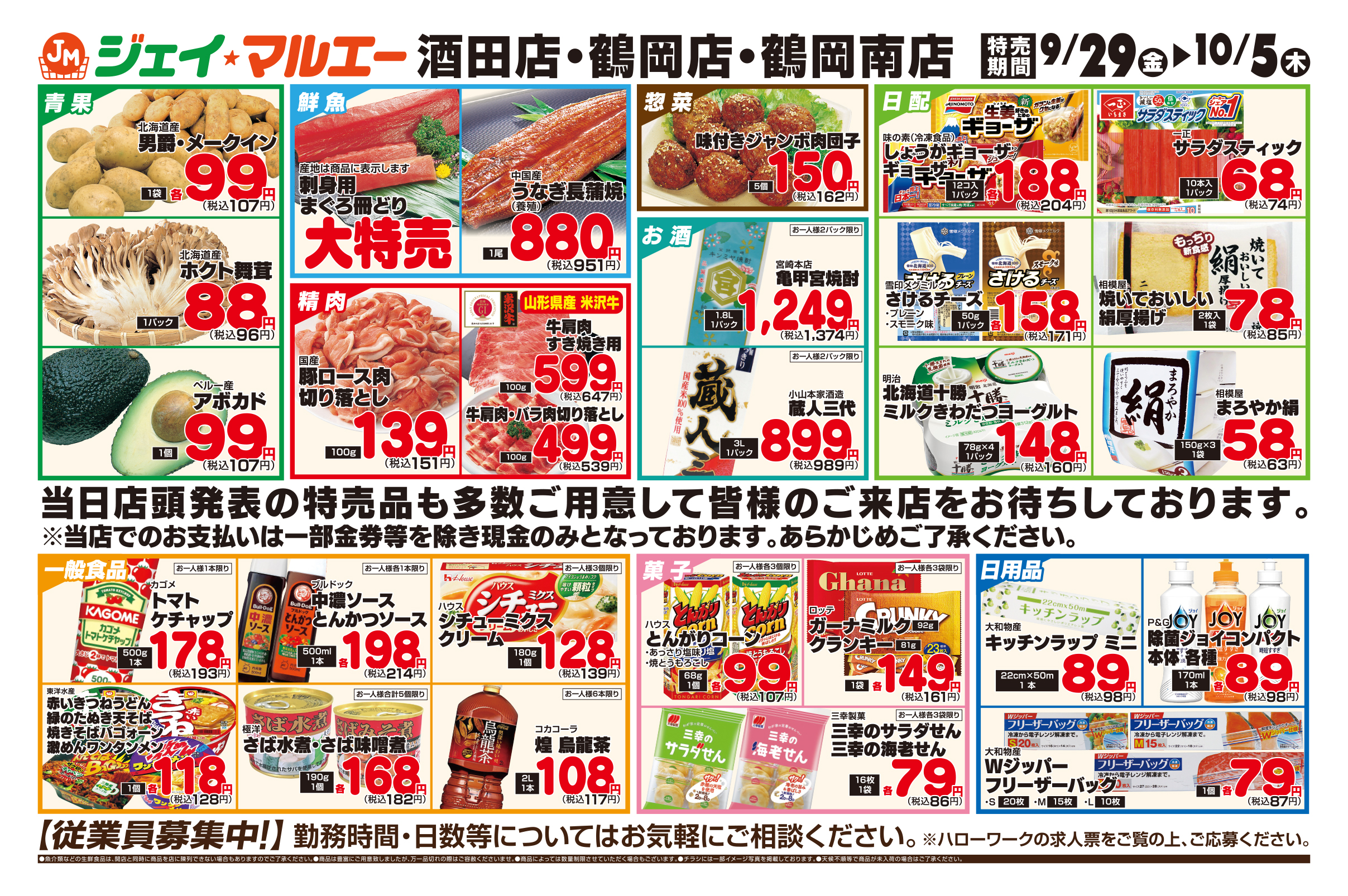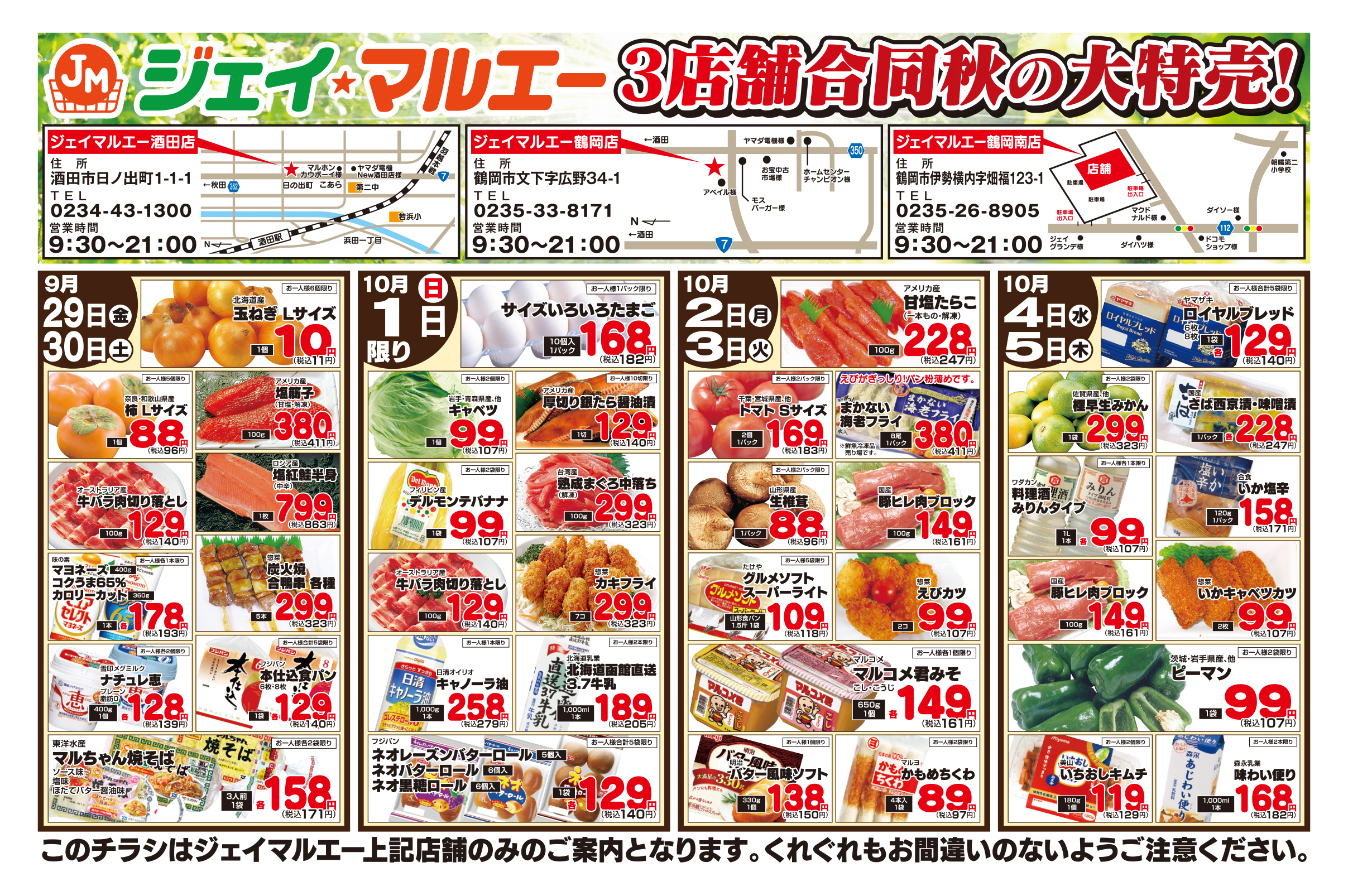9月29日~酒田店・鶴岡店・鶴岡南店 3店舗合同秋の大特売!チラシ情報